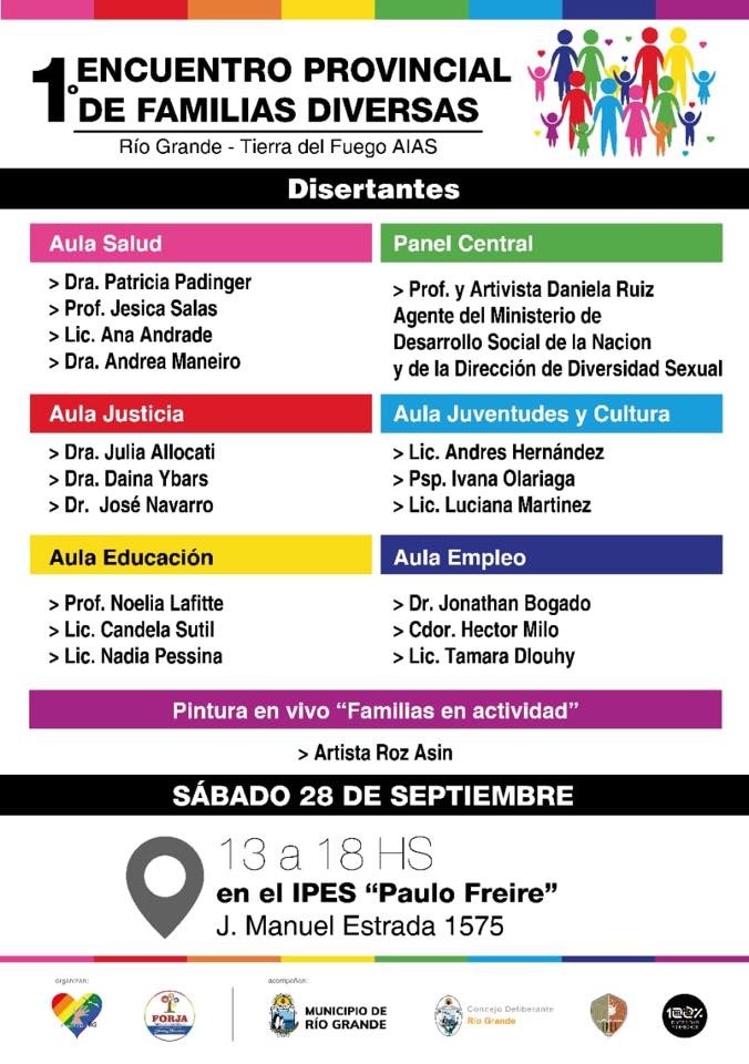 Este sábado 28 de septiembre de 13 a 18hs se llevará a cabo el 1° Encuentro Provincial de Familias Diversas en el IPES ‘Paulo Freire’ (Estrada 1575). El evento que es acompañado por el Municipio de Río Grande, lo desarrollará la organización ‘Igual a Igual’ junto a la Secretaría de Géneros y Diversidad de Forja Nacional por parte de la juventud.