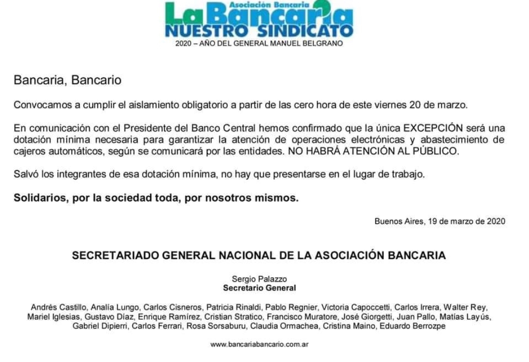 En un comunicado firmado por Sergio Palazzo, secretario general de La Bancaria, el sindicato informó que «en comunicación con el presidente del Banco Central» confirmaron que los empleados bancarios están exceptuados de sus tareas de atención al público y sólo mantendrán guardias mínimas para garantizar operaciones electrónicas y el abastecimiento de cajeros automáticos