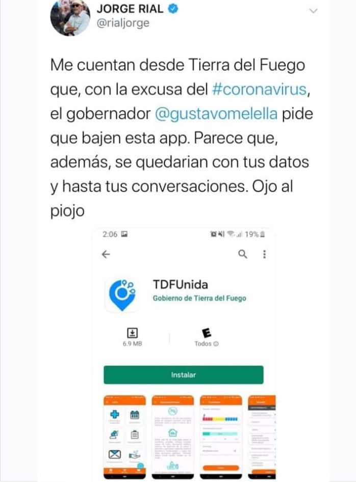 La controversia tuvo eco en un posteo del periodista Jorge Rial, quien publicó en su cuenta de Twiter: “me cuentan desde Tierra del Fuego que, con la excusa del #coronavirus, el gobernador @Gustavomelella pide que bajen esta app. Parece que además se quedarían con tus datos y tus conversaciones. Ojo al piojo”