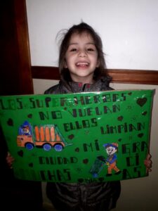 La actividad que propuso la docente a cargo, consistió en principio en dibujar a los superhéroes de la televisión, para luego poner la mirada en aquellos trabajadores que hoy, durante la pandemia, se mantienen realizando tareas esenciales. En ese sentido, Mía dijo que «ella quiso hacer un cartel a los señores de la basura, que son los están trabajando y mantienen su ciudad limpia».