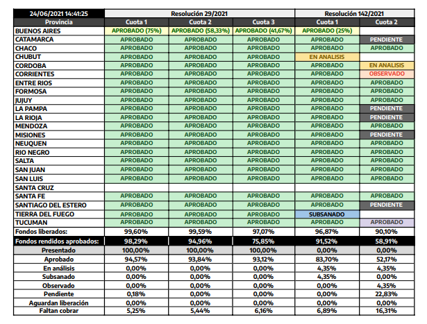Ante la falta de rendición del Gobierno Provincial, desde el Gobierno Nacional no abonaron la cuota 2 correspondiente al mes de mayo de 2021 (Resolución 142 MTN), pese a que todas las jurisdicciones que cumplieron con la documentación en tiempo y forma, percibieron esta cuota del fondo compensador, que se lee en el cuadro “APROBADO”, tal como se refleja en el cuadro de la fotografía.