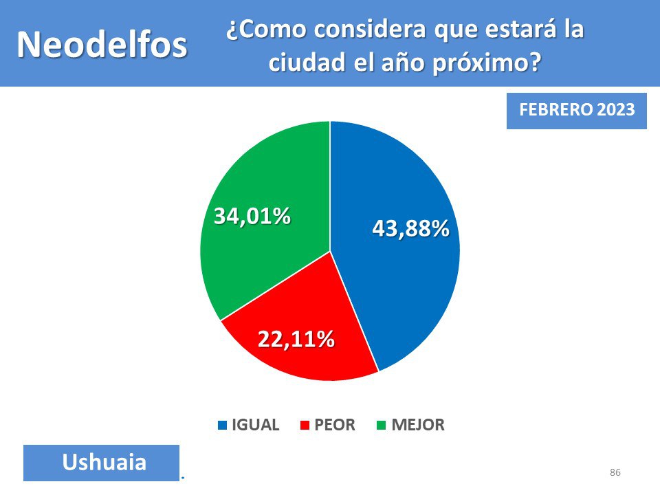 Para el caso de Ushuaia los números no son tan buenos, ya que un 22,11% cree que el año que viene la ciudad va a estar peor y un 43,88% que va a estar igual, mientras que un 34,01% cree que la situación mejorará.