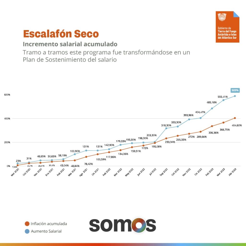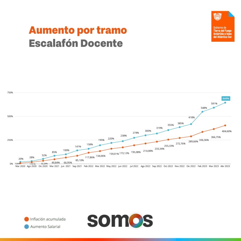 En cuanto al escalafón docente, Tierra del Fuego es la única provincia de la Patagonia que alcanzó durante el primer semestre de este año un incremento en los salarios del 41,26%, seguida de Neuquén y Santa Cruz con un 28%, Chubut con un 24% y Río Negro con un 19%. Así, en marzo de 2022 un docente cobraba $73.807,67 mientras que en mayo de 2023 percibió $185.883,49, un aumento acumulado de un 134% contra un 103,6% de inflación. Desde marzo de 2020 a la fecha el aumento salarial del sector alcanzó un 644% contra el 404,60% de inflación.