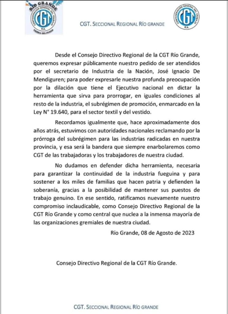 Sumándose al reclamo, la CGT de Río Grande emitió un comunicado reclamando una reunión con el secretario de Industria de nación para manifestar su preocupación por la tardanza en dictar “la herramienta que sirva para prorrogar, en iguales condiciones al resto de la industria, el subrégimen de promoción para el sector textil y de vestido”.
