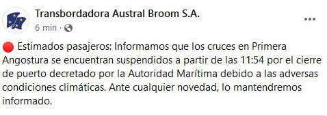 Debido al alerta meteorológico por fuertes vientos, y con ráfagas que superarán los 100 km/h en el sector norte de la isla, la firma TABSA (Transbordadora Austral Broom S.A.) informó que se encuentran suspendidos los cruces de las barcazas desde Tierra del Fuego hacia el continente en el sector chileno.