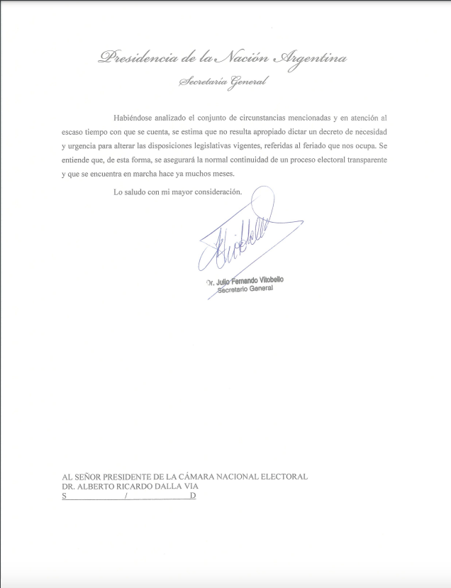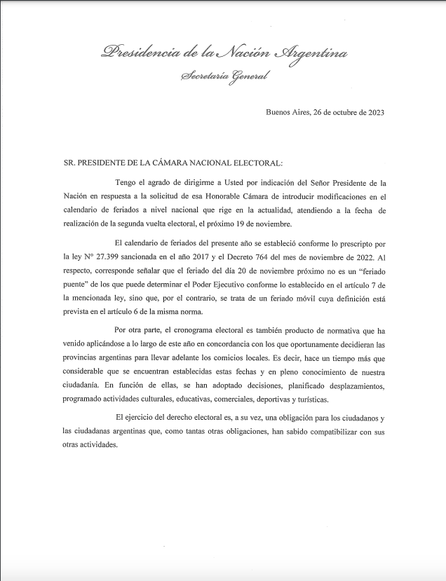 El Poder Ejecutivo Nacional, con la firma del Secretario General de la Presidencia, Julio Vitobello, dispuso no modificar el feriado del fin de semana largo del sábado 18, domingo 19 y lunes 20 de noviembre, contestando así el pedido de la Cámara Nacional Electoral (CNE).