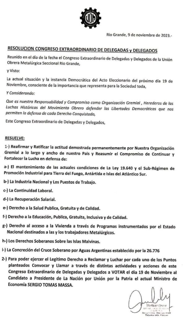 En este marco, la Unión Obrera Metalúrgica de Río Grande a través del Congreso Extraordinario de Delegadas y Delegados tomo posición a favor del actual ministro de Economía, Massa. Considerando que es su “responsabilidad y compromiso como organización gremial, herederos de las luchas históricas del movimiento obrero defender las libertades democráticas que permiten la defensa de cada derecho conquistado”, dice el comunicado.