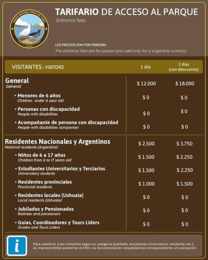 Finalmente, para residentes provinciales el precio es de $1000 pesos y $1500 por dos días. Exceptuando a los residentes de Ushuaia que tanto como jubilados y pensionados como los guías, coordinadores y Tours Liders, no pagan.