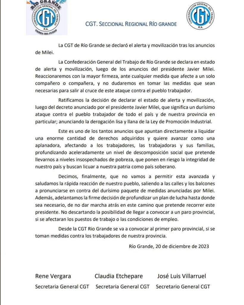 La CGT de Río Grande se declaró en estado de alerta y movilización tras el DNU y los anuncios realizados por el presidente Javier Milei en la noche de ayer.