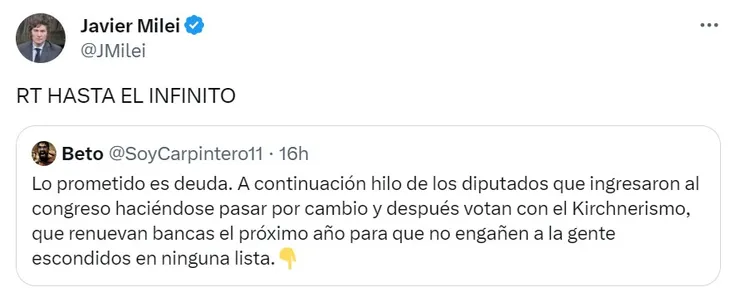 El seguidor libertario, nombrado en la red social X (ex Twitter) como «@SoyCarpintero11», publicó un hilo que apunta a las elecciones 2025: