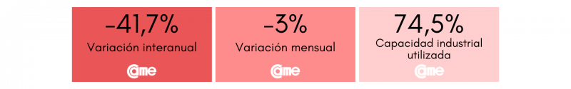 El rubro experimentó un desplome de 41,7% anual a precios constantes, siendo el sector con mayor retroceso. En términos mensuales, también se observó una retracción, pero más suave (-3%). Las empresas trabajaron con 74,5% de su capacidad instalada, 2,2 puntos menos que en diciembre.