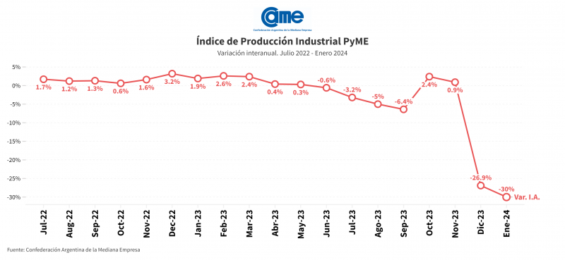 La industria manufacturera pyme comenzó el año con una fuerte caída. En enero, se registró una merma del 30% en la facturación del sector medida a precios constantes respecto del mismo mes del año pasado. Es el segundo mes consecutivo que la actividad fabril se retrae confirmando una tendencia preocupante. En la comparación mensual desestacionalizada, también se registró un descenso del 9,1%