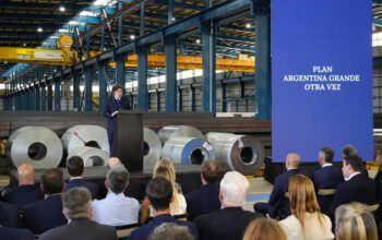 Del otro lado de la valla, también se fue acumulando gente. Con cierta heterogeneidad inicial, el espacio fue nucleando mayoritariamente a jóvenes, especialmente varones, a medida que transcurrían las horas. Esta fue una de las primeras ocasiones en que, al menos en suelo correntino, se hicieron visibles las dos facciones que pugnan por el poder interno en la Casa Rosada: las “fuerzas del cielo” con sus remeras color bordó y los libertarios con sus camisetas violetas. Los militantes celebraron la visita presidencial, exhibiendo banderas argentinas y los libros de Milei. También hicieron su aparición algunos leones de peluche y una motosierra de cartón, con la que el presidente evitó posar para las fotografías.
